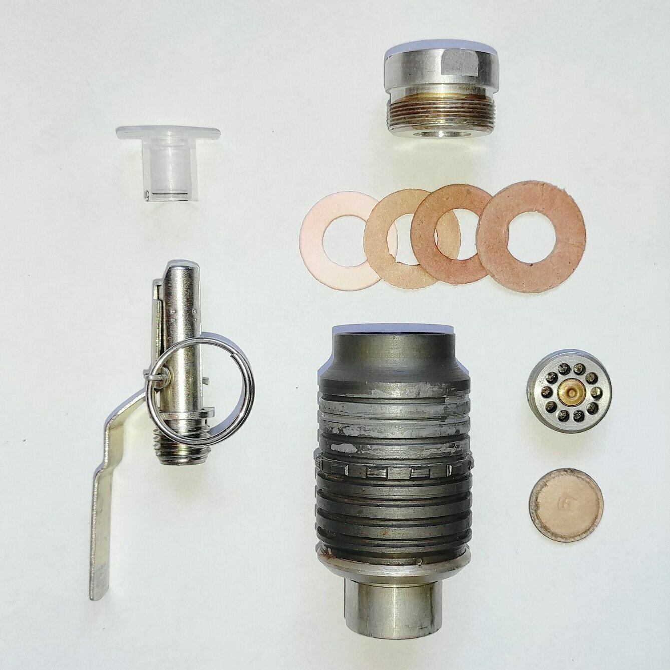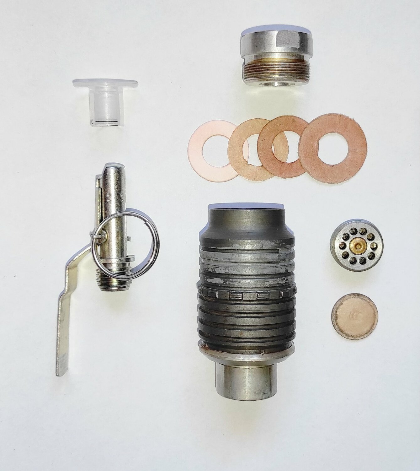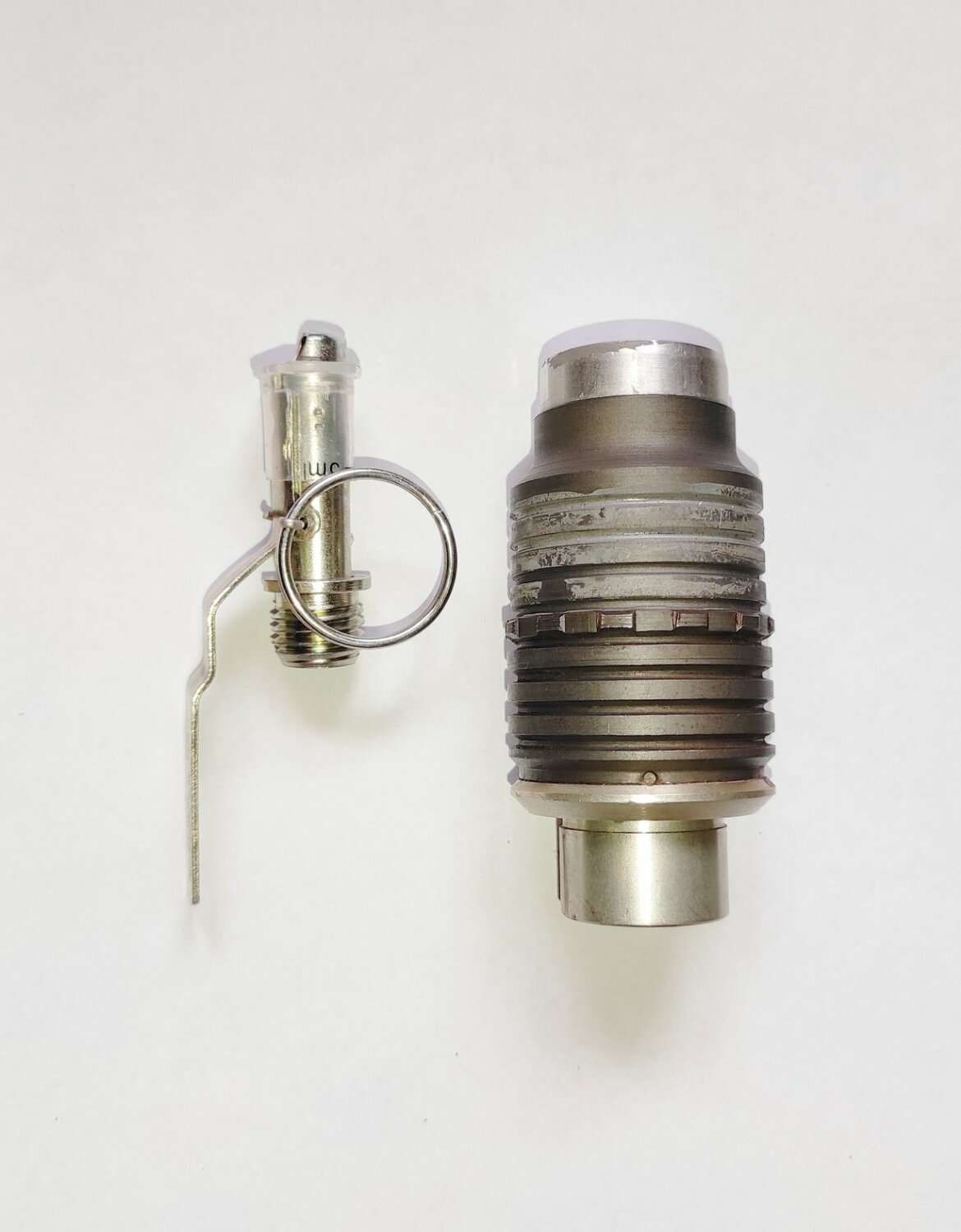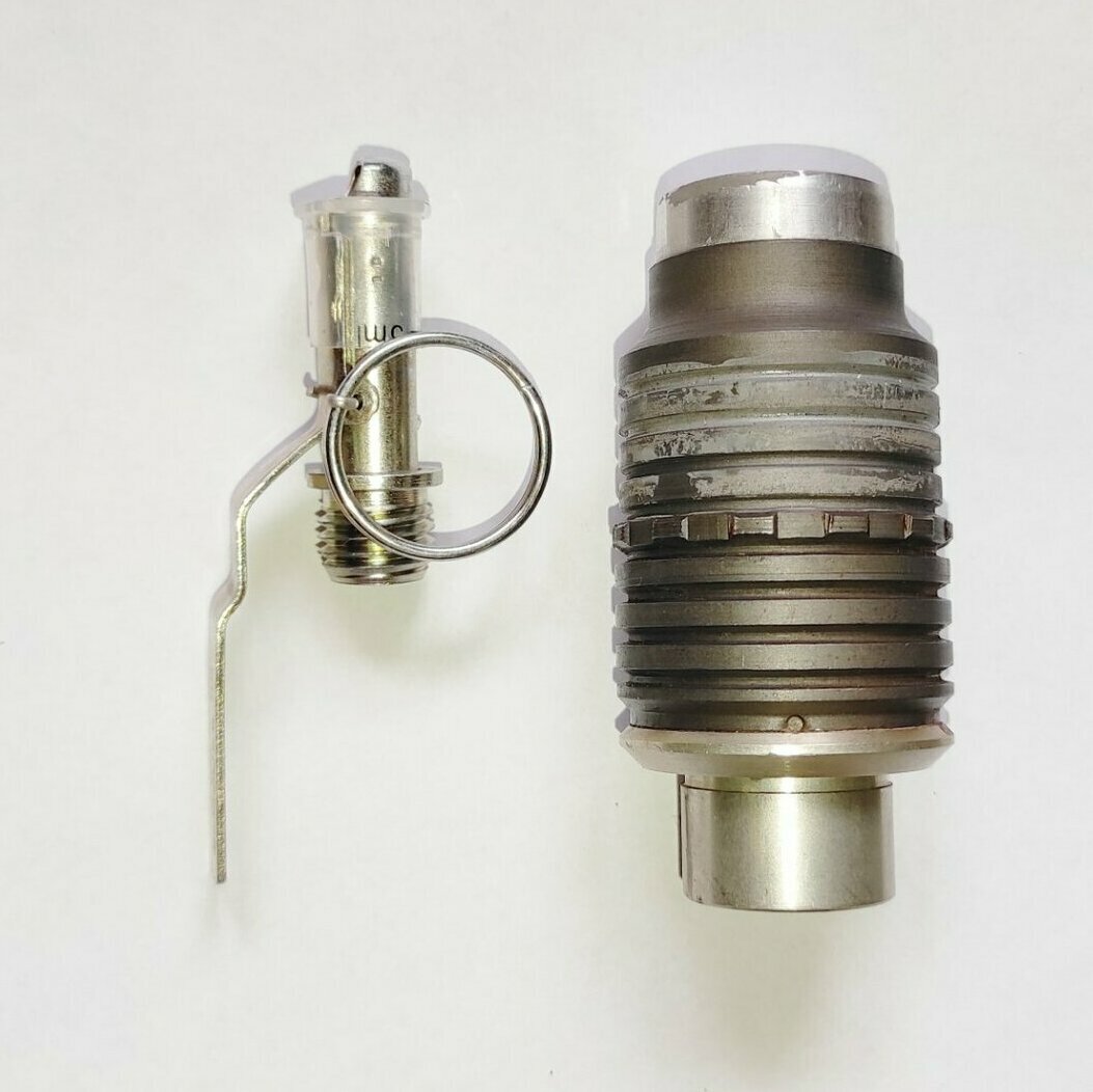 Макет гранаты "Хаттабка" из гранатомётного выстрела ВОГ-25. Деактив, не из инертного. Вещь нечастая. Запал УЗРГМ-2 - деактив. Сохранены оригинальные картонные прокладки и внутренняя рубашка. Всё полностью разборное.