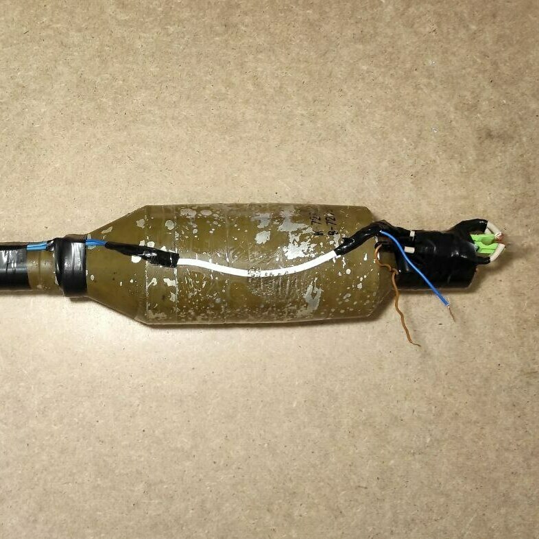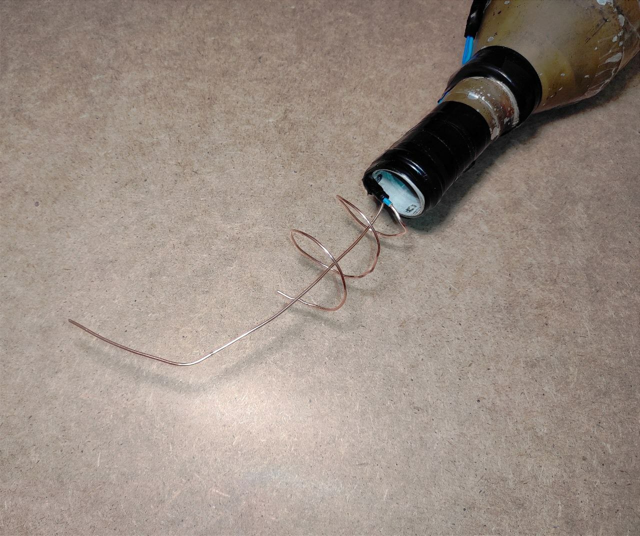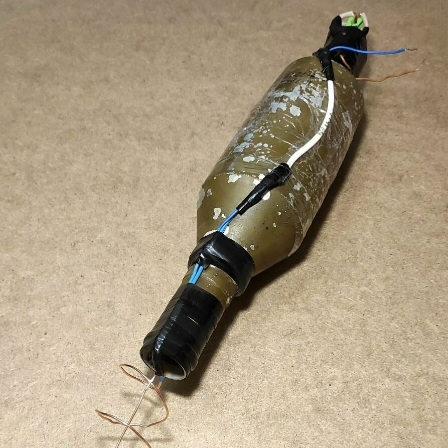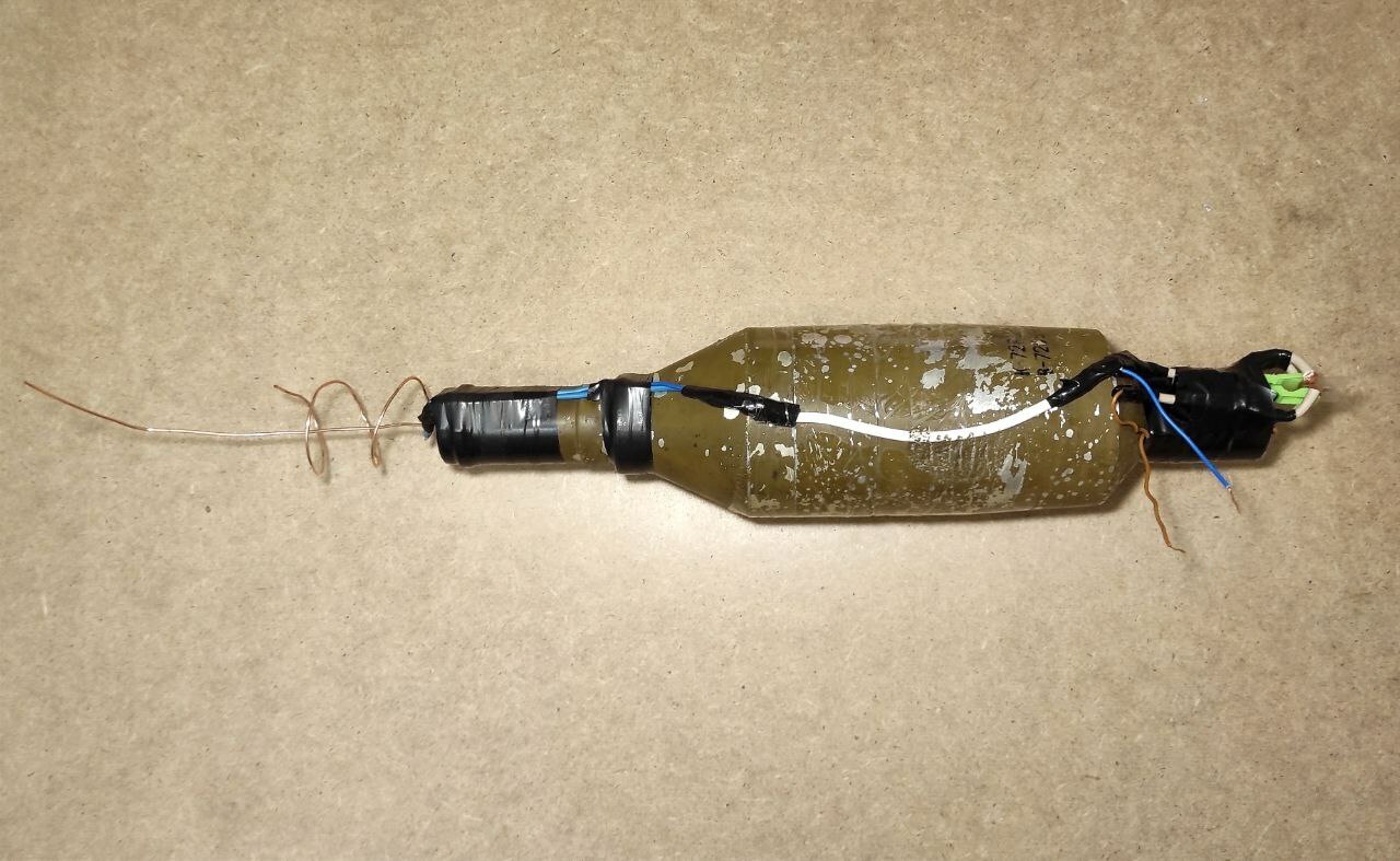 Макет кумулятивного боеприпаса для ударного дрона (квадрокоптера). Изготовлен из учебной основной боевой части выстрела ПГ-7ВР для гранатомёта РПГ-7. Полностью функционален - электрическая цепь работает. В донной части установлен учебный электродетонатор. Стоит предохранитель "прищепка" и замыкатель "кипятильник". Есть вывод проводов для подключения к источнику питания (батарейка, аккумулятор дрона и т.д.) Вес данного макета соответствует боевому аналогу.