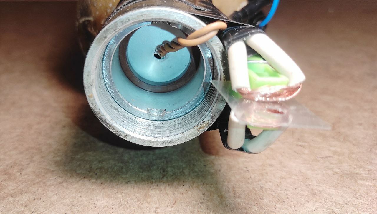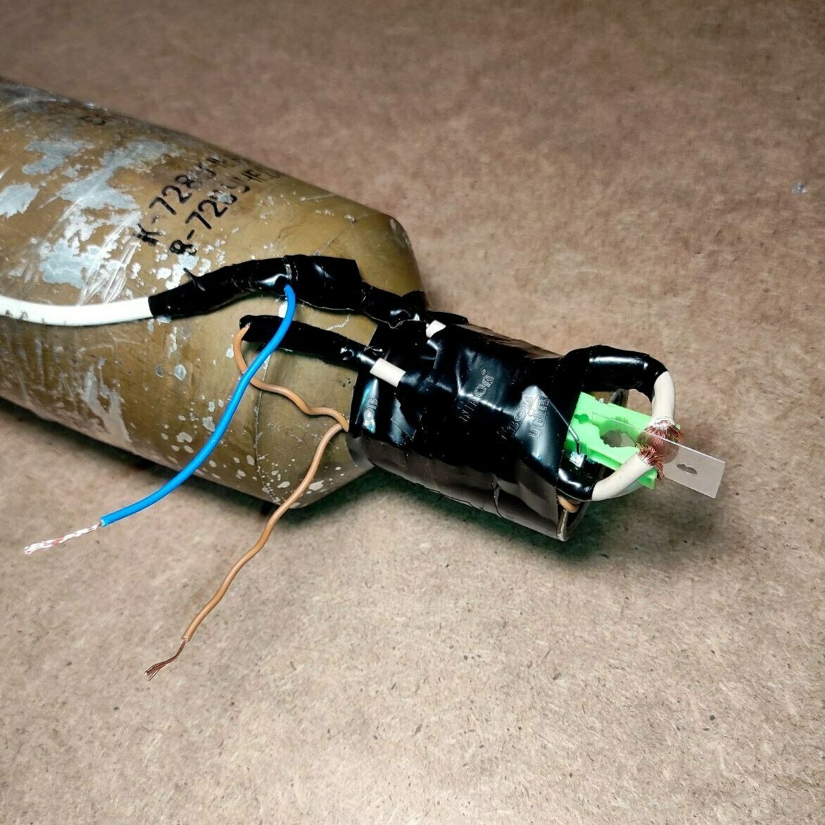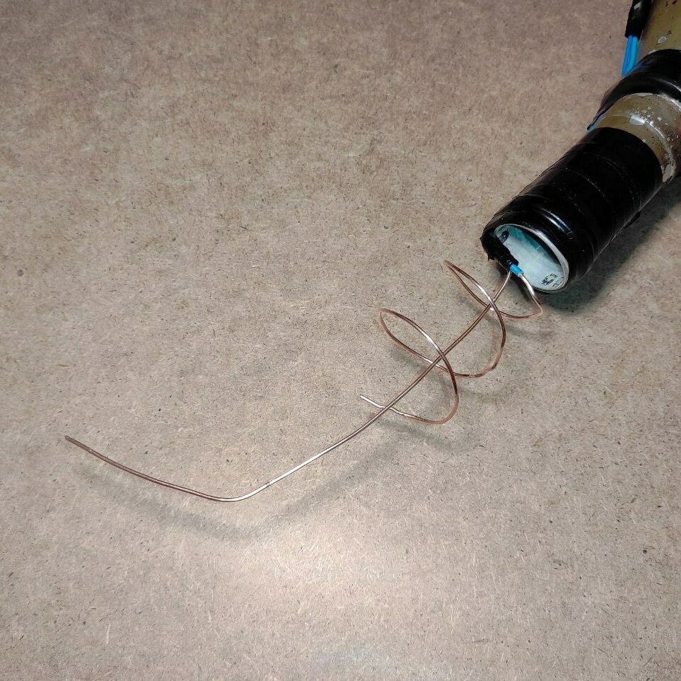 Макет кумулятивного боеприпаса для ударного дрона (квадрокоптера). Изготовлен из учебной основной боевой части выстрела ПГ-7ВР для гранатомёта РПГ-7. Полностью функционален - электрическая цепь работает. В донной части установлен учебный электродетонатор. Стоит предохранитель "прищепка" и замыкатель "кипятильник". Есть вывод проводов для подключения к источнику питания (батарейка, аккумулятор дрона и т.д.) Вес данного макета соответствует боевому аналогу.